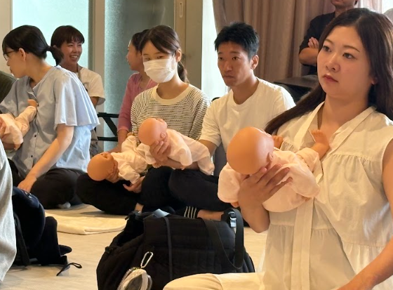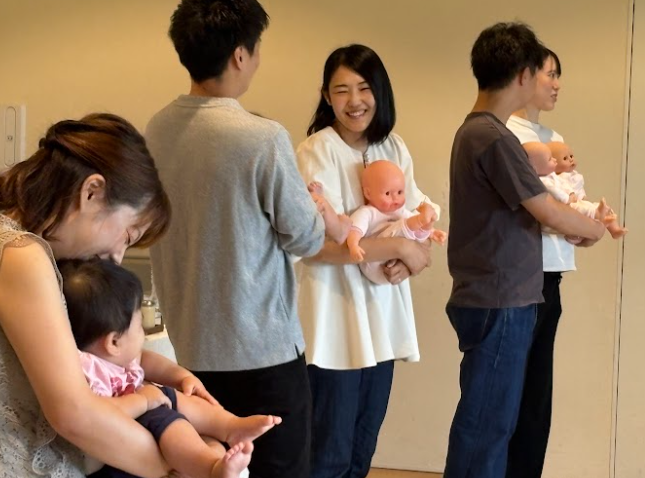 先生のアドバイスに耳を傾けながら、生後間もない赤ちゃんや、赤ちゃんの人形を抱っこするパパやママたち。