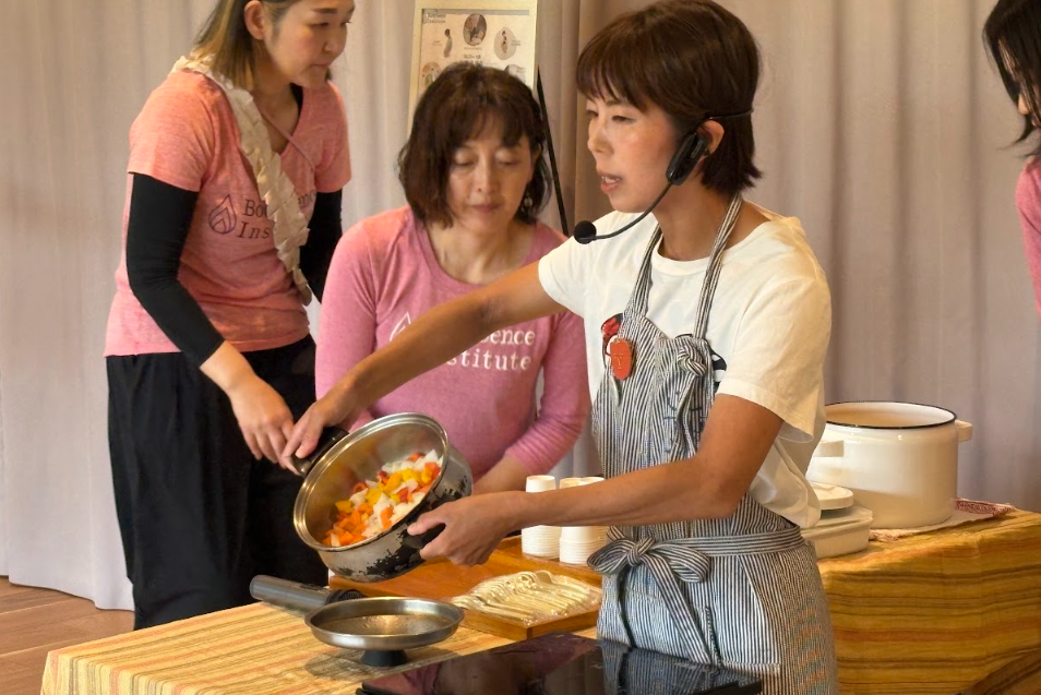 この講座は、すこやかな妊娠・出産・産後をサポートする、家族みんなのための栄養講座で、野菜のうまみを生かしたスープの作り方を学び、試食もしていました。