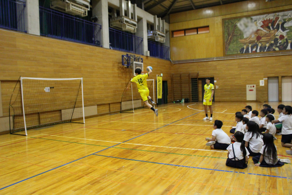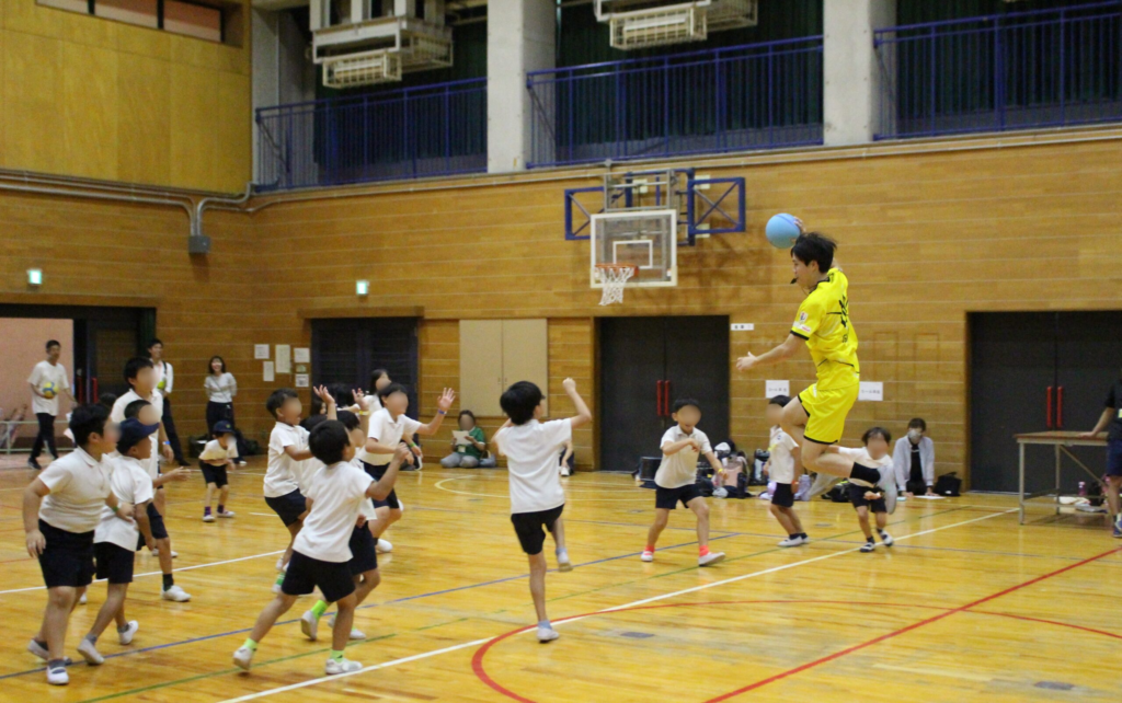 当日は、選手が講師となり、ハンドボール体験やジャンプシュートを取り入れたドッジボールを実施。